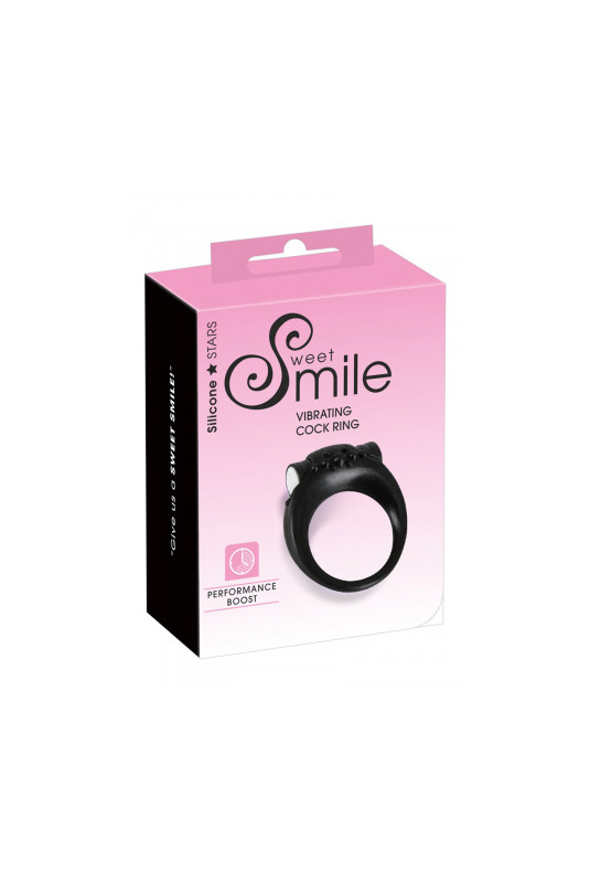 Sweet Smile Vibrating cock ring est un anneau pénien noir en silicone très extensible, équipé d'un petit stimulateur vibrant amovible.