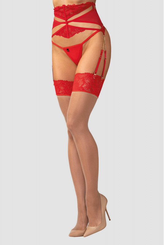 Bas chair nude avec de la dentelle rouge décorative aux cuisses. Fabriqué à partir d’un matériau doux et extensible qui épouse doucement le corps. La dentelle est assortie à d’autres pièces de la collection Matildea, ce qui rend ces bas sensuels pour un look sexy.