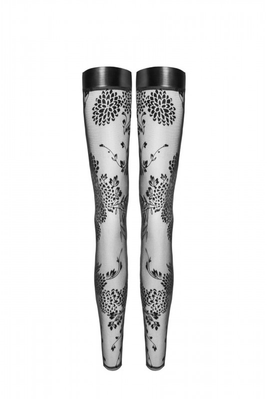 De très chics et originaux bas sans pied sexy et sophistiquée en tulle floqué de motifs de fleurs, avec une jarretière autofixante en wetlook qui sert le haut des cuisses.