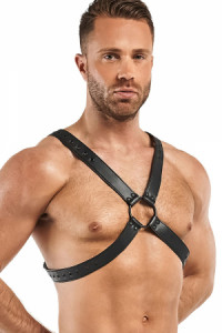 Harnais de bondage ajustable pour homme, style affirmé et jeux de domination.