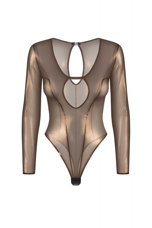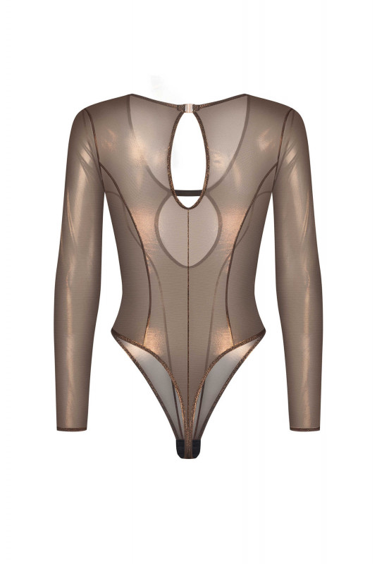 Un body en maille transparente avec des reflets dorés rares. Le design ajusté accentue les courbes, tandis que le tissu légèrement transparent ajoute une touche de sensualité subtile. Les manches longues donnent un look élégant et raffiné.