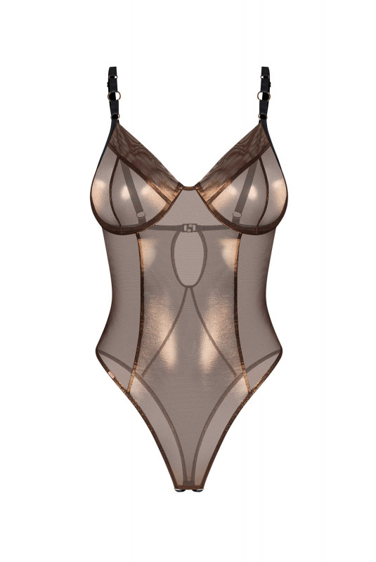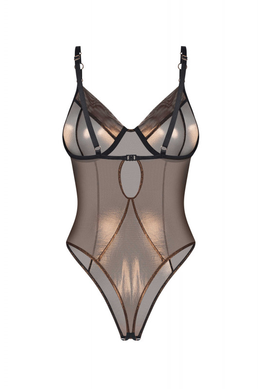 Body sans crochet en maille dorée délicate et transparente. L’armature accentue le buste, tandis que la coupe ajustée améliore la silhouette féminine. L’entrejambe ouvert ajoute une touche provocante et audacieuse au design global.