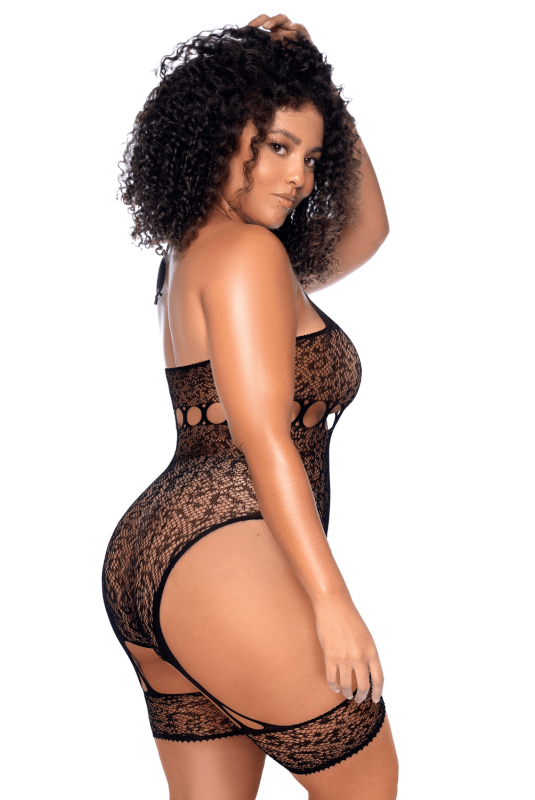 Entièrement réalisé en résille noire à imprimé léopard, il se distingue par une encolure tour de cou ouverte et une résille transparente offrant un rendu audacieux et assumé. De larges bandes façon jarretières, intégrées au design, encadrent les hanches et allongent visuellement les jambes, structurant la silhouette avec élégance.
