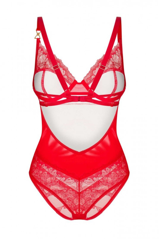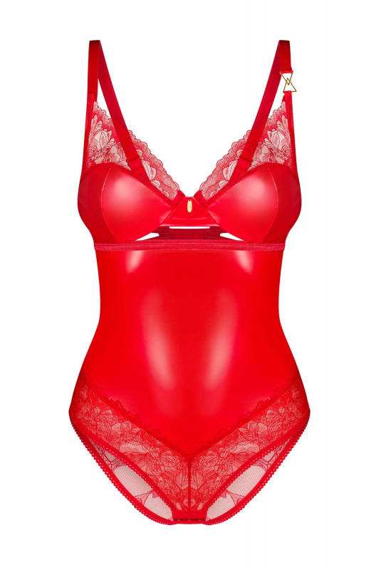 Body rouge avec dentelle décorative et découpe sous la poitrine et pendentif avec la bague de signet Obsessive.