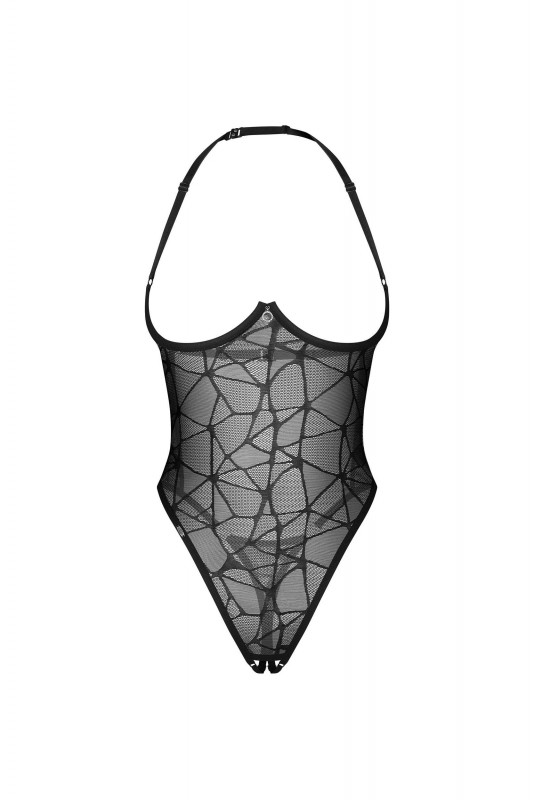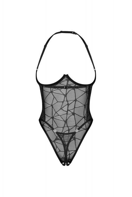 Un body teddy avec un design ouvert. Il présente une dentelle transparente avec un motif géométrique, des armatures et des anneaux décoratifs.