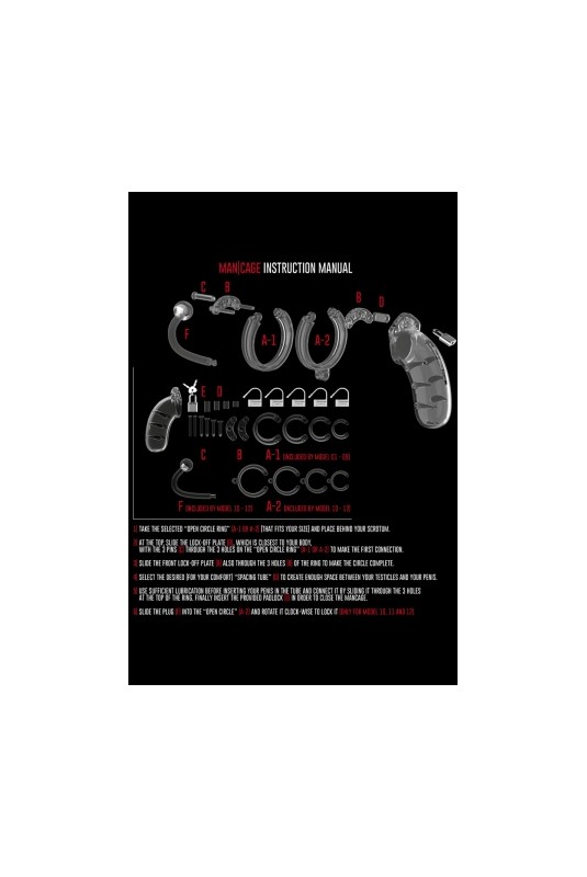 Ajustable, la cage se compose de quatre parties qui s'emboitent parfaitement. Deux grandes vis de guidage relient les parties supérieures tandis qu'une tige conique relie les bagues à la cage. Les différents anneaux et tiges fournis vous permettront d'adapter au mieux la cage à votre morphologie pour vous offrir un maximum de confort. Enfin, le plug anal amovible se visse très simplement à la base de la cage de chasteté.