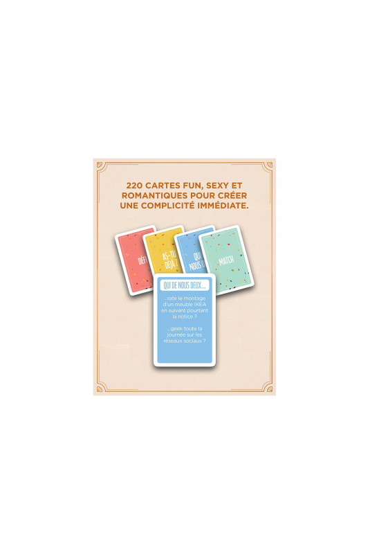 - 220 cartes réparties en 4 catégories (Défis, As-tu déjà..., Qui de nous deux..., Match !)