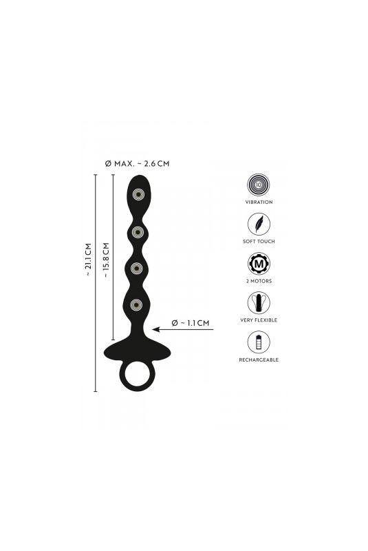 Flexible Anal Beads with Jumping Vibrations d'ANOS offre un plaisir anal intense et profond. Le cordon anal flexible stimule grâce à 4 boules vibrantes à rainures de tailles différentes. Pas moins de 2 moteurs assurent 10 modes de vibration puissants qui se commandent facilement par simple pression sur un bouton. Il existe également un mode spécial pour les Jumping Vibrations, où les impulsions sautent d'une boule vibrante à l'autre. Pour des effets de surprise excitants lors des jeux anaux !