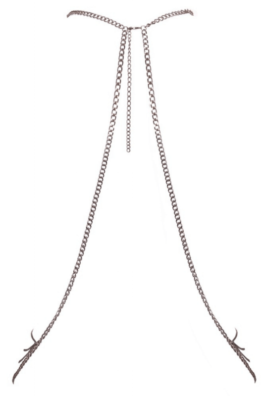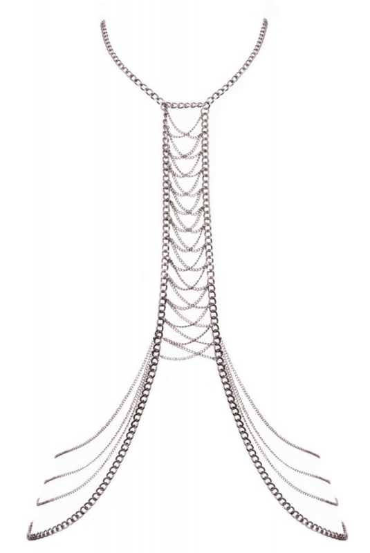 Un look glamour et affirmé, pensé pour attirer tous les regards. Cette chaîne de corps argentée sublime la silhouette grâce à ses chaînettes délicates positionnées entre les seins et au-dessus des hanches, créant un jeu de lignes sensuel et élégant.