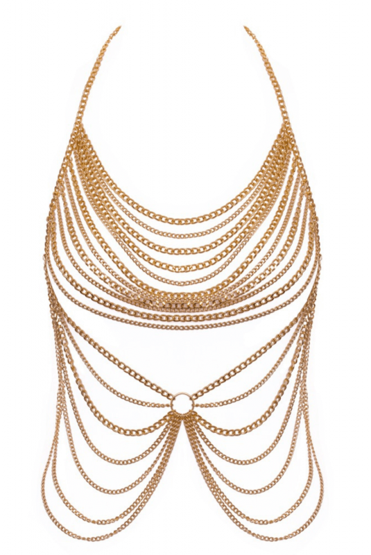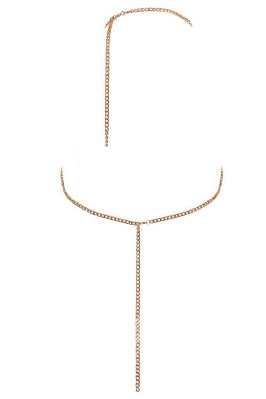 Un look glamour et affirmé qui sublime la silhouette. Cette chaîne de corps dorée attire tous les regards avec sa garniture de chaînes décoratives sur les seins et le ventre, dessinant des lignes sensuelles et élégantes sur le corps. Pensée pour s’adapter à chaque morphologie, elle est entièrement réglable et dispose de deux fermetures à mousqueton à l’arrière, permettant un ajustement précis au niveau de la nuque et de la taille.