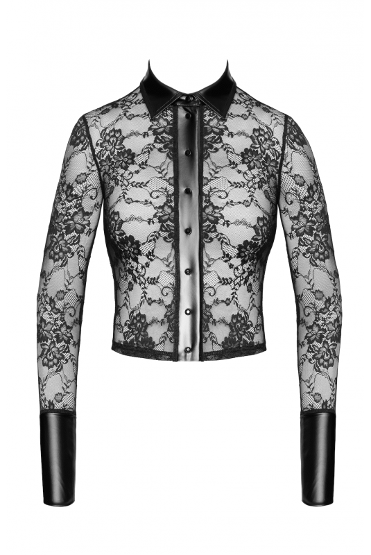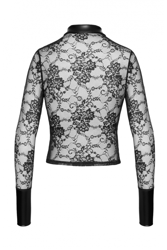 Design : Doté d'une fermeture à pression sur toute la longueur avec des boutons-pression en strass noirs, ce chemisier ajoute une touche d'éclat à la délicate dentelle. Le col et les poignets structurés effet mouillé équilibrent la texture féminine avec des éléments audacieux et modernes.