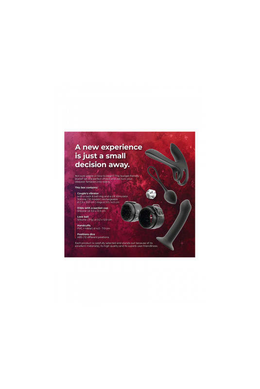 Le Couples Love Toy Starter Set Together exclusif de Magic Shiver avec 5 sextoys de qualité supérieure rigoureusement sélectionnés inspire les couples à de nouvelles aventures intimes. 3 jouets raffinés en silicone, des menottes souples et un dé d'amour invitent à expérimenter le plaisir et à atteindre des orgasmes intenses. Ces jouets intimes faciles à utiliser sont optimaux pour une entrée ludique dans le monde des sextoys.