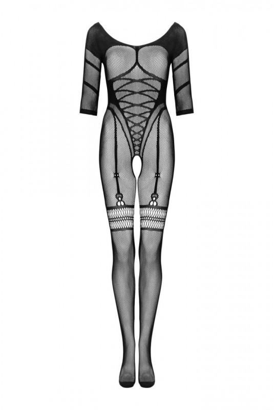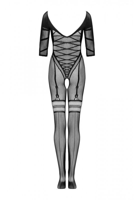 Combi bodystocking noir en imitation d'un corset body sur le devant et le dos en combinaison avec des bas.