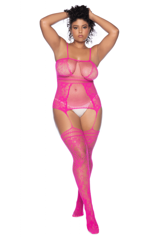 Sublimez vos courbes avec cette combinaison grande taille en résille florale rose sophistiquée, dotée d’un porte-jarretelles intégré et de bas assortis. Ce design séduisant combine un ajustement parfait et un effet sculptant pour une allure irrésistible.