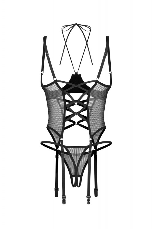 Un ensemble composé d’un corset et d’un string ouvert à l’entrejambe. Le corset, en matière brillante et en maille, façonne optiquement la silhouette. Les armatures sous le buste fournissent un lifting subtil, et les jarretelles offrent des options de style supplémentaires.
