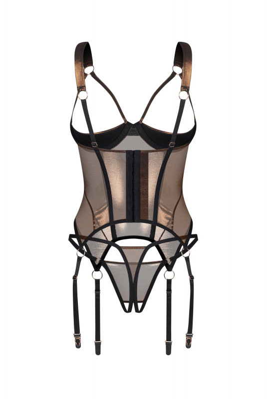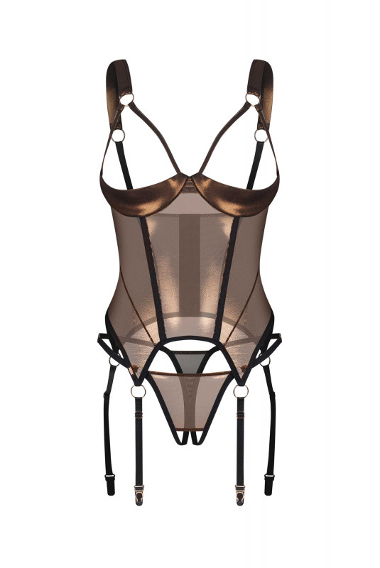 Un corset aux tons rares dorés combinant une maille transparente avec un scintillement subtil et un design moulant. Le corset à baleines sculpte visuellement la silhouette, met en valeur la taille et rehausse le buste, tandis que les coutures verticales créent un effet amincissant. Des lanières en jarretelles ajustables complètent le look, et le string ouvert ajoute une touche audacieuse et provocante.