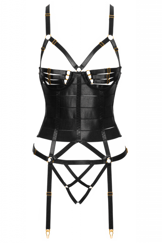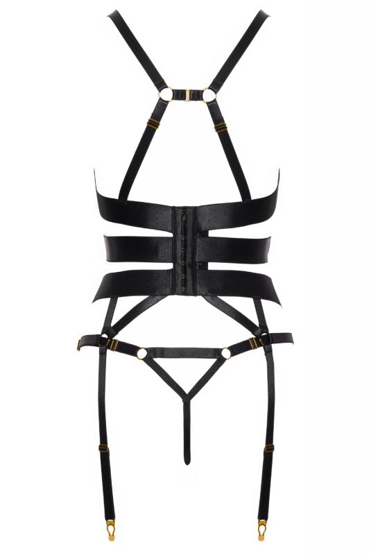 Le corset présente un design harnais avec multiples sangles extensibles à l’aspect satin et des accessoires métalliques couleur or. Les bretelles sont reliées par une sangle avec fermeture à crochet. Les bretelles, sangles des bonnets et jarretelles sont réglables.