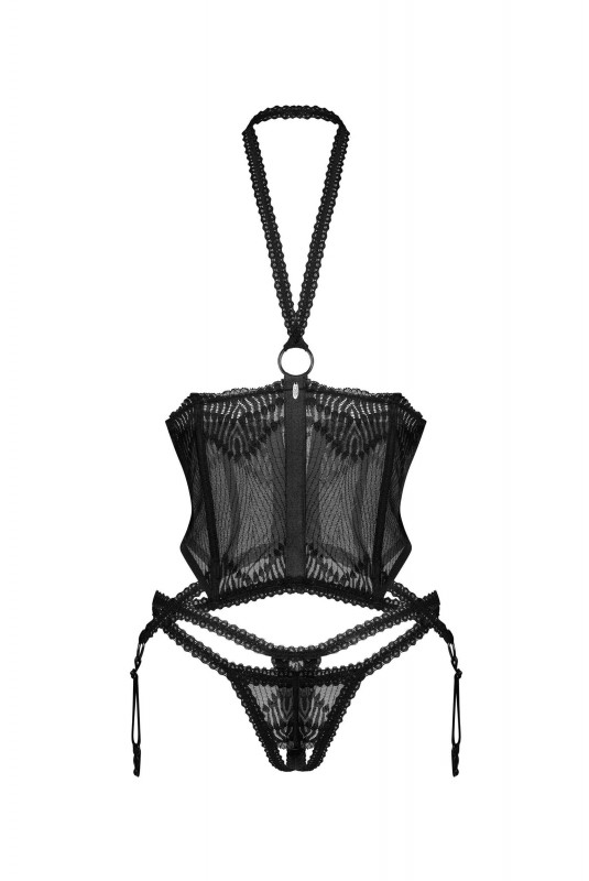 Le corset Alliane met en valeur le buste et accentue la taille, tandis que le string ouvert apporte une touche finale épicée. Fabriqué à partir de mailles délicates et de dentelle, cette pièce allie élégance et séduction. Les baleines verticales façonnent visuellement la silhouette, et le dos à lacets permet un ajustement personnalisé. Le corset est doté d’une lanière en dentelle et de bretelles qui facilitent l’association du corset avec des bas. Des anneaux décoratifs sous le buste et sur les hanches complètent le look.