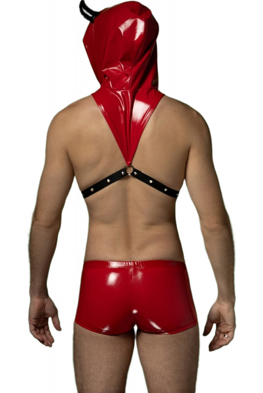 Le déguisement homme démon 2 pièces de J Lingerie sappuie sur un look visuel fort avec un effet faux cuir rouge immédiatement identifiable.