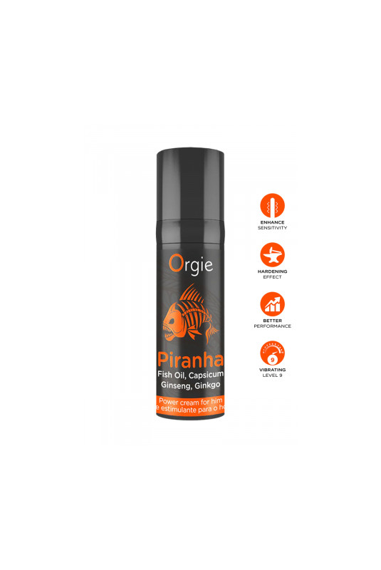 La Piranha Power Cream dOrgie est une crème stimulante pour le pénis avec effet chaud-froid et vibrant(niveau 9) qui permet d améliorer la sensibilité du pénis et d'obtenir une érection plus rapide et plus ferme.