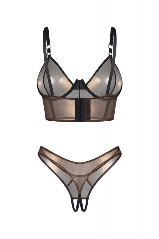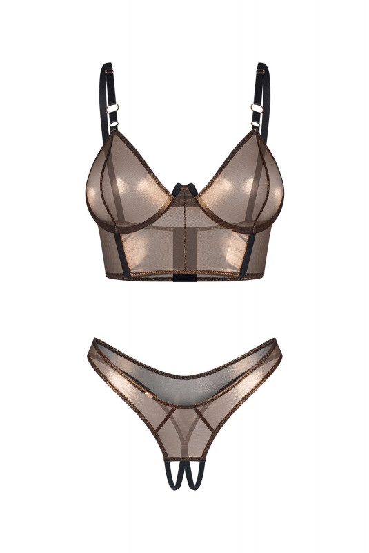 Ensemble de deux pièces en maille dorée avec une finition transparente. Le haut à armatures rehausse la poitrine, tandis que le string ouvert à l’entrejambe ajoute de l’audace et crée un point culminant provocateur du set.
