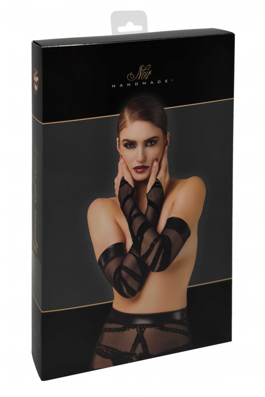 Matière : Confectionnés en tulle floqué délicat au motif d'inspiration bondage, ces gants offrent une finition semi-transparente et veloutée. Une bande Powerwetlook douce assure un maintien parfait et un contraste subtil avec le tissu raffiné.
