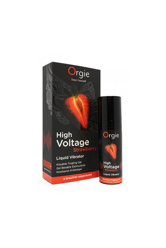 "High Voltage Strawberry Liquid Vibrator" est le gel intime d'excitation extra fort pour couples de la marque de cosmétique érotique Orgie. Il est recommandé pour le sexe oral car il est parfumé à la fraise et embrassable.