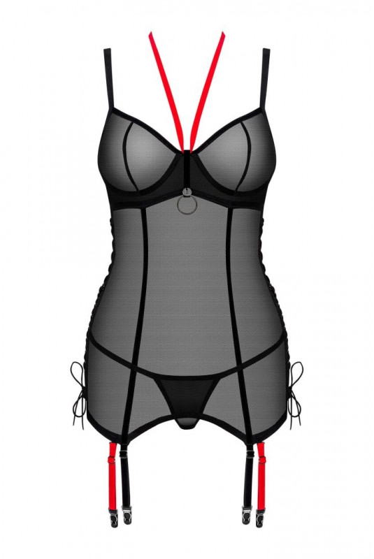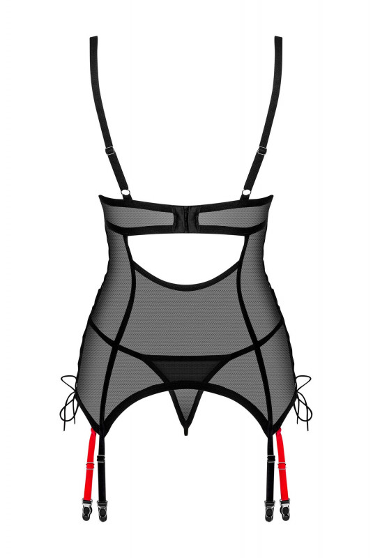 La guêpière et le string Glandez originaux avec ses doubles jarretelles noirs et rouge avec un ajustement parfait grâce à la fermeture en plusieurs étapes, au laçage et aux bretelles réglables.