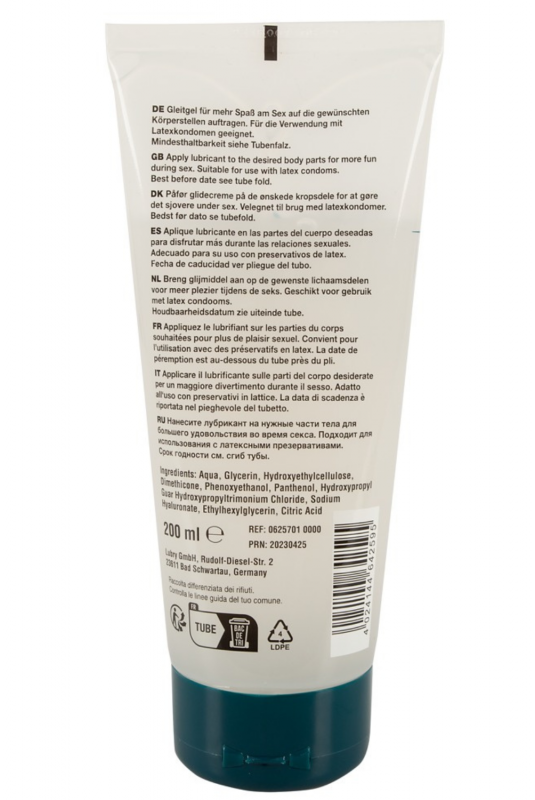 Le pH est adapté au plaisir anal, et la texture du gel est extra souple grâce à l’hyaluron. Le panthénol contribue à apaiser et à soutenir la barrière cutanée. Compatible avec les préservatifs en latex, ce lubrifiant est neutre en goût et en odeur, et se rince facilement après usage.
