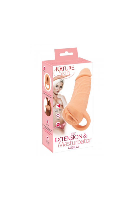 Le 2in1 Extension + Masturbateur MEIUM de Nature Skin possède un Design extérieur réaliste et excitant avec une ouverture en forme de vagin et un manchon en forme de pénis veiné avec gland rebondi.