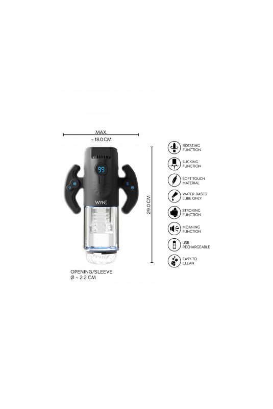 Masturbator 11 de la marque Wyne est un masturbateur puissant à double moteur, qui masse le pénis de tous les côtés avec son manchon intérieur rotatif qui se déplace de haut en bas.