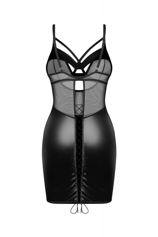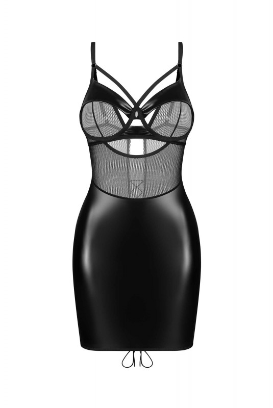 Une nuisette et un string fabriqués à partir d’une combinaison de tissu semblable au cuir et de maille transparente. La coupe ajustée avec un laçage à l’arrière accentue la taille, tandis que les bretelles d’encolure ajoutent une touche audacieuse. Les bonnets à armatures façonnent le buste, et le string assorti complète le look.