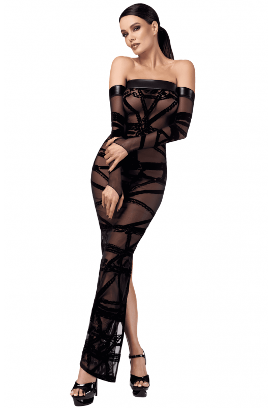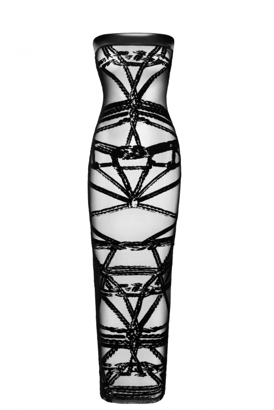 Laissez-vous séduire par la sensualité de cette robe longue libertine et sexy envoûtante en tulle floqué, ornée d'un motif unique inspiré du bondage. Conçue pour captiver, elle allie élégance audacieuse et allure moderne, créant un look qui ne passera pas inaperçu.