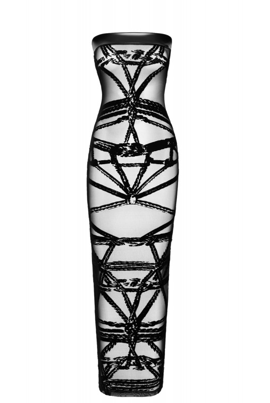 Matière : Confectionnée en tulle floqué délicat, cette robe arbore un motif bondage inspiré de l'art du Shibari. Son tissu doux et semi-transparent allie transparence sensuelle et fini velouté, tandis que la bande Powerwetlook sur le haut assure confort et maintien.