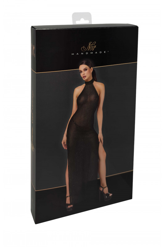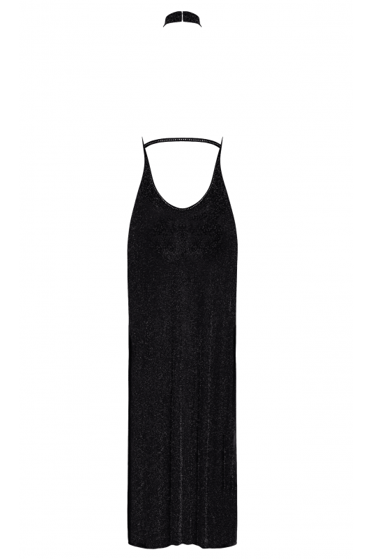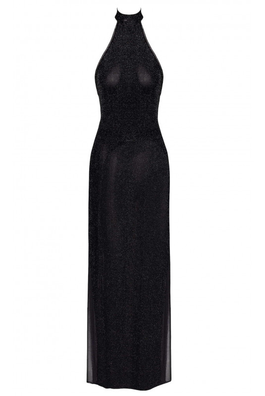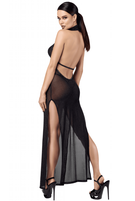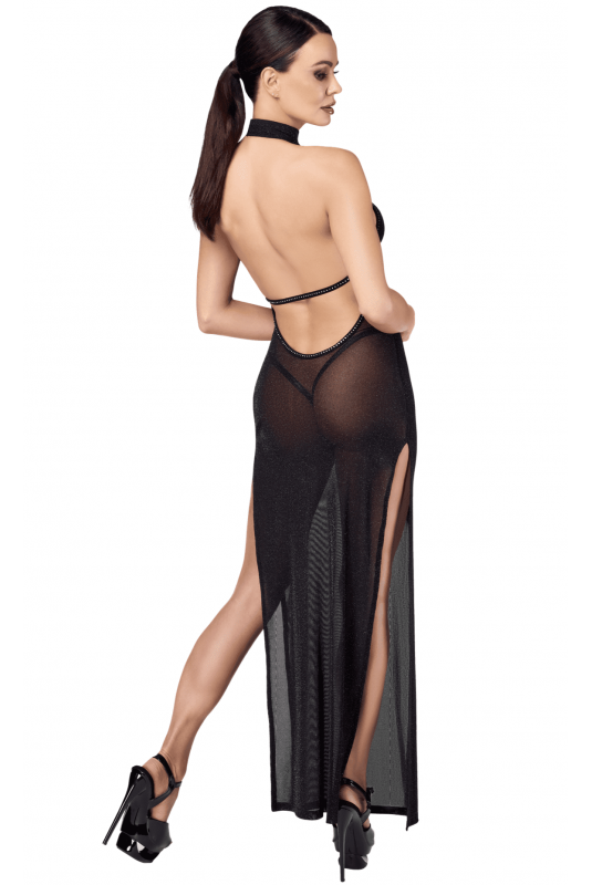 Design : Dotée d'un col montant raffiné et de délicates fermetures à crochets, cette robe allie allure et sensualité. Un dos nu audacieux attire tous les regards, sublimé par une bretelle en strass scintillants au centre pour une touche de glamour. De profondes fentes latérales allongent les jambes et ajoutent un mouvement spectaculaire, sublimant la silhouette saisissante de la robe.