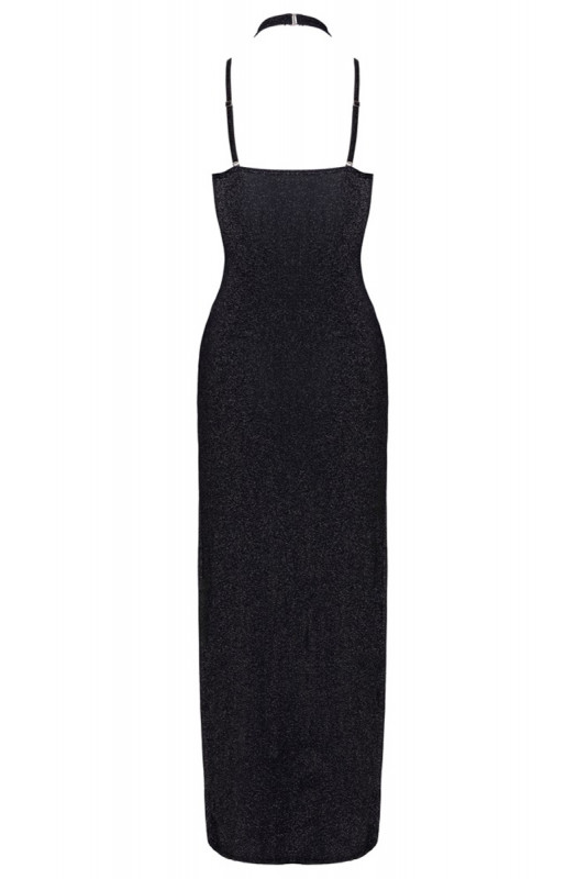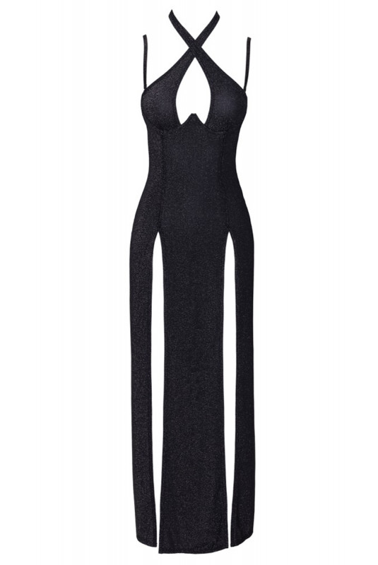 Envoutez vos partenaires avec cette élégante robe longue en noir argenté et irisé. Cette robe longue fendue de la marque Cottelli PARTY a une coupe ajustée avec des bonnets à armatures intégrés permettant de sublimer le décolleté. Le tour de cou (avec fermeture à crochets) peut aussi être porté croisé devant.