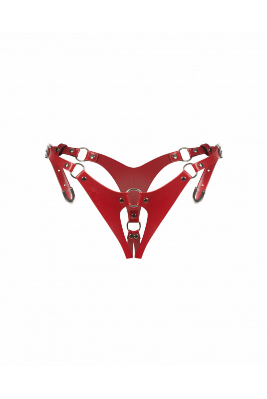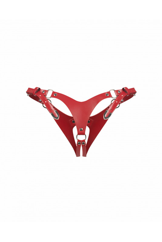 String fetish ouvert à l’entrejambe fait de lanières rouges reliées par des anneaux en argent. Les sangles réglables permettent un ajustement parfait, tandis que le design sans crochet ajoute de l’audace. Il peut être associé à d’autres pièces de la collection Inferro.