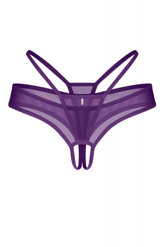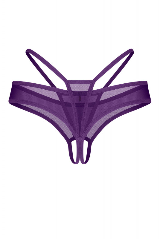String violet ouvert en maille transparente dans une teinte audacieuse et vibrante. Le design à lanières accentue les hanches et l’arrière, tandis qu’un charme argenté à l’avant ajoute un détail subtil mais frappant.