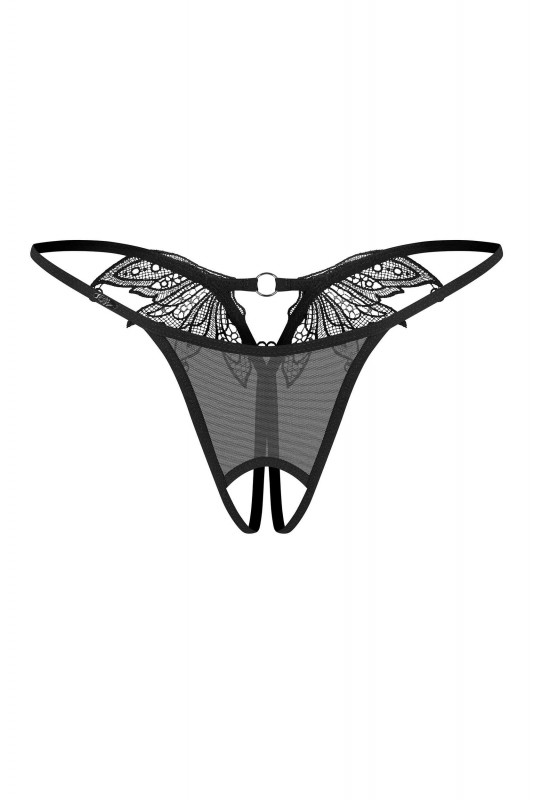 String ouvert au un design exceptionnellement audacieux. Devant lisse et classique en maille semi-transparente et dos en dentelle richement décoré.