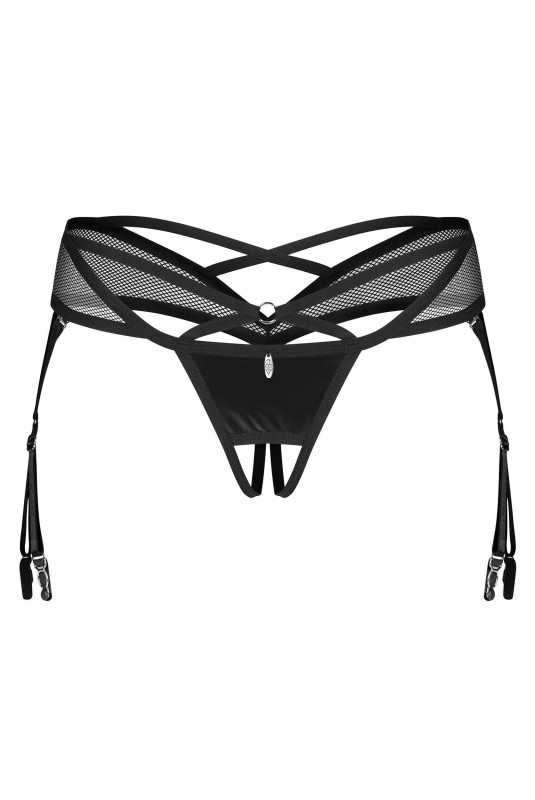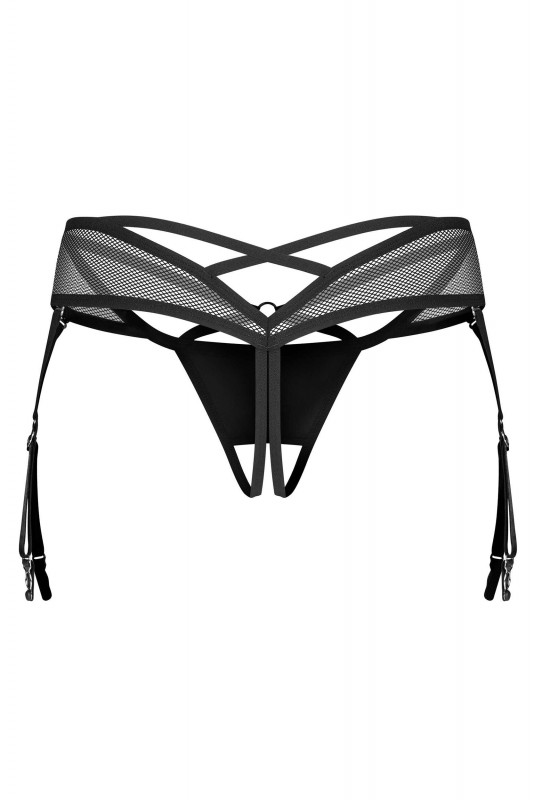 On craque pour cet indispensable et incontournable string ouvert en imitation de cuir brillant et en maille. Les lanières en jarretelle accentuent les cuisses, tandis que la découpe à l’entrejambe ajoute une touche audacieuse. Parfait pour compléter des ensembles de la collection Dominna.