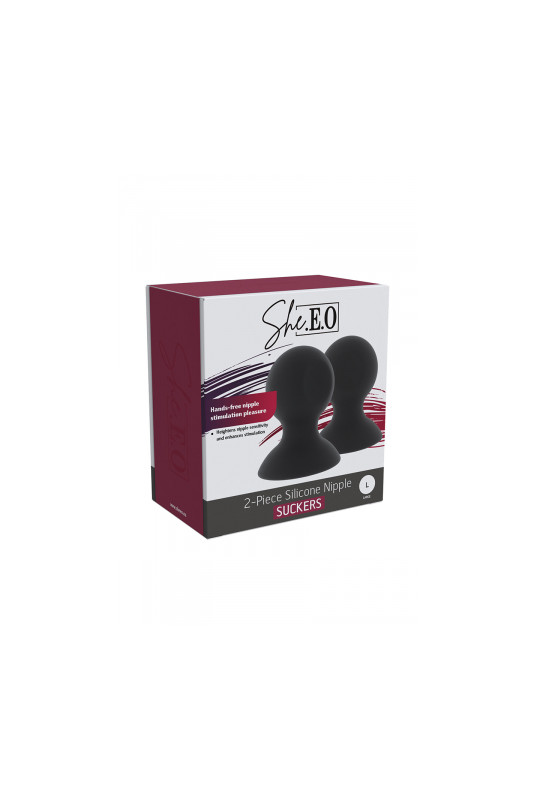 Suceurs de mamelons en silicone She.E.O, taille L, conçus pour offrir une stimulation douce, progressive et totalement mains libres.
