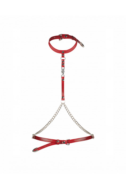 Un harnais Fetish relié par une chaîne argentée à la ceinture de taille. Il crée des lignes géométriques sur le corps qui soulignent la silhouette. Des matériaux de haute qualité et des fermetures réglables garantissent un port confortable.