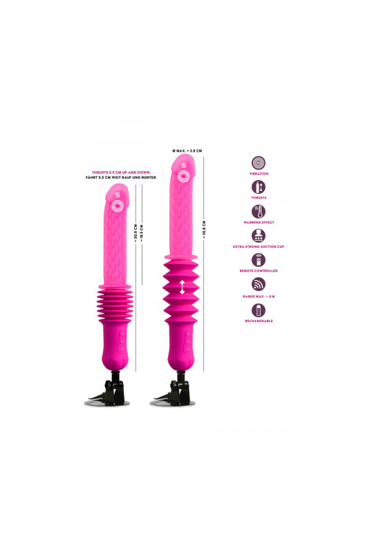 Grâce à sa ventouse ajustable à 90°, il se fixe solidement sur les surfaces lisses pour une utilisation mains libres. La télécommande permet de contrôler facilement les 3 vitesses de poussée et les 10 modes de vibration, séparément ou combinés.